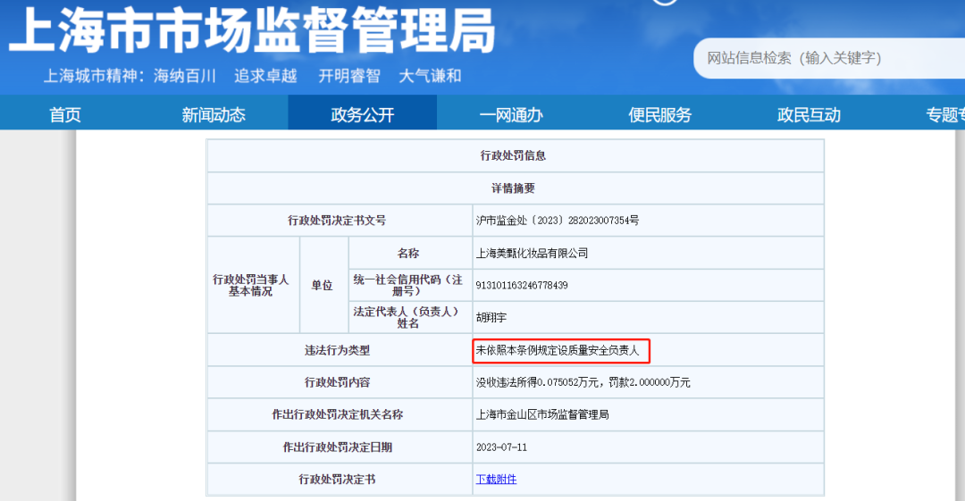 据披露,上海美甄化妆品有限公司(以下简称“上海美甄”),因原质量安全负责人离职后未及时招聘新人致使岗位空缺,构成“未依照规定设质量安全负责人”等违法行为,被罚2万元。